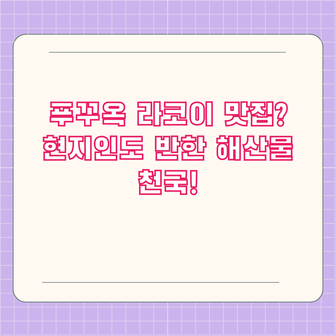 푸꾸옥 여행, 해산물 맛집은 어디가 좋을까요? 싱싱한 해산물에 시원한 맥주 한잔, 푸꾸옥의 정취를 느끼며 즐기고 싶은데 마땅한 곳을 찾지 못하셨나요? 오늘은 푸꾸옥 현지인들에게도 사랑받는 해산물 맛집, 라코이(Ra Khoi)를 소개합니다. 가격, 분위기, 메뉴, 위치 등 라코이에 대한 모든 것을 자세히 알려드릴테니, 푸꾸옥 여행 계획에 참고하세요! 지금 바로 푸꾸옥 맛집 라코이(Ra Khoi)의 매력에 빠져보세요!