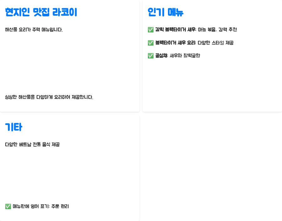 | 라코이(Ra Khoi) | 즈엉동 야시장 근처 | 현지인 맛집, 저렴한 가격, 신선한 해산물 (품질은 한국보다 다소 낮음), 에어컨 없음, 넓고 붐빔 | 저렴 | 갈릭 블랙타이거 새우, 공심채 |