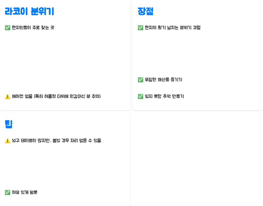 라코이는 현지인들이 주로 찾는 곳이기 때문에, 에어컨이 없다는 점은 미리 알고 가시는 것이 좋습니다. 특히 여름철에는 더위에 조금 민감하신 분들에게는 다소 불편할 수 있습니다.
